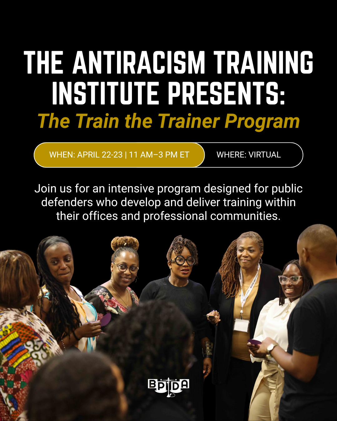 Location: Virtual The Black Public Defender Association Train the Trainer program is a two-day virtual intensive program designed for public defenders who develop and deliver training within their offices and professional communities. This program equips participants to design and facilitate training through a racial lens—starting from the premise that race is not an add-on to […]